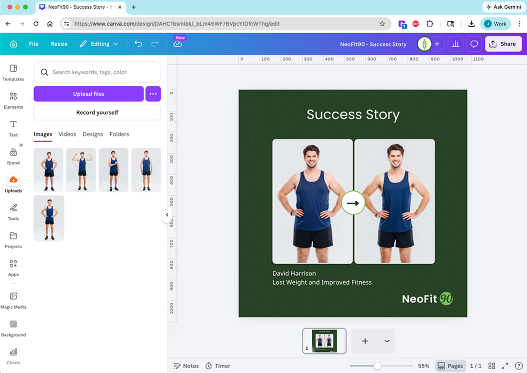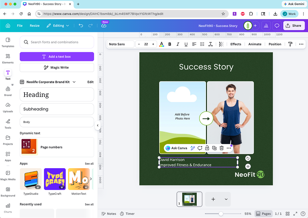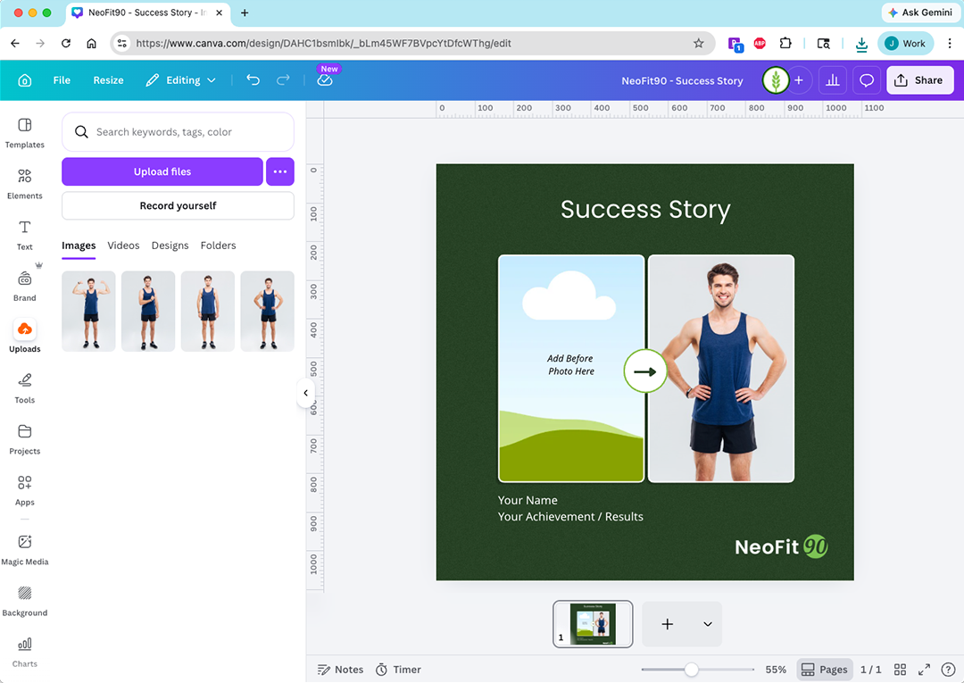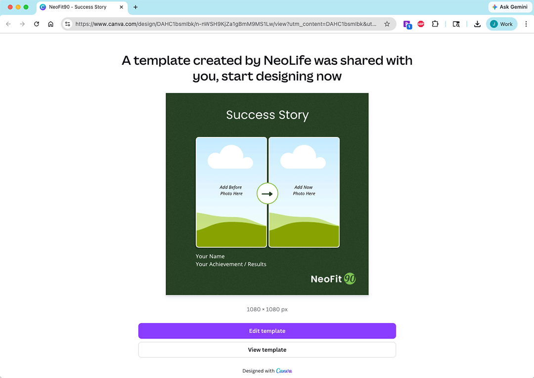 Our new NeoFit90 Canva templates are designed to help you create beautiful, inspiring posts in just a few minutes. Whether you want to share your results, a 45-day check-in, a favorite healthy recipe, a personal win, or a goal you are working toward, there is a template for you.