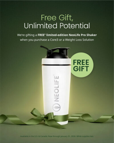 From January 5 through January 31, 2026, receive a free limited-edition NeoLife Pro Shaker when you purchase Core3 or the Weight Loss Solution (Shape Up Solution in Canada)*.