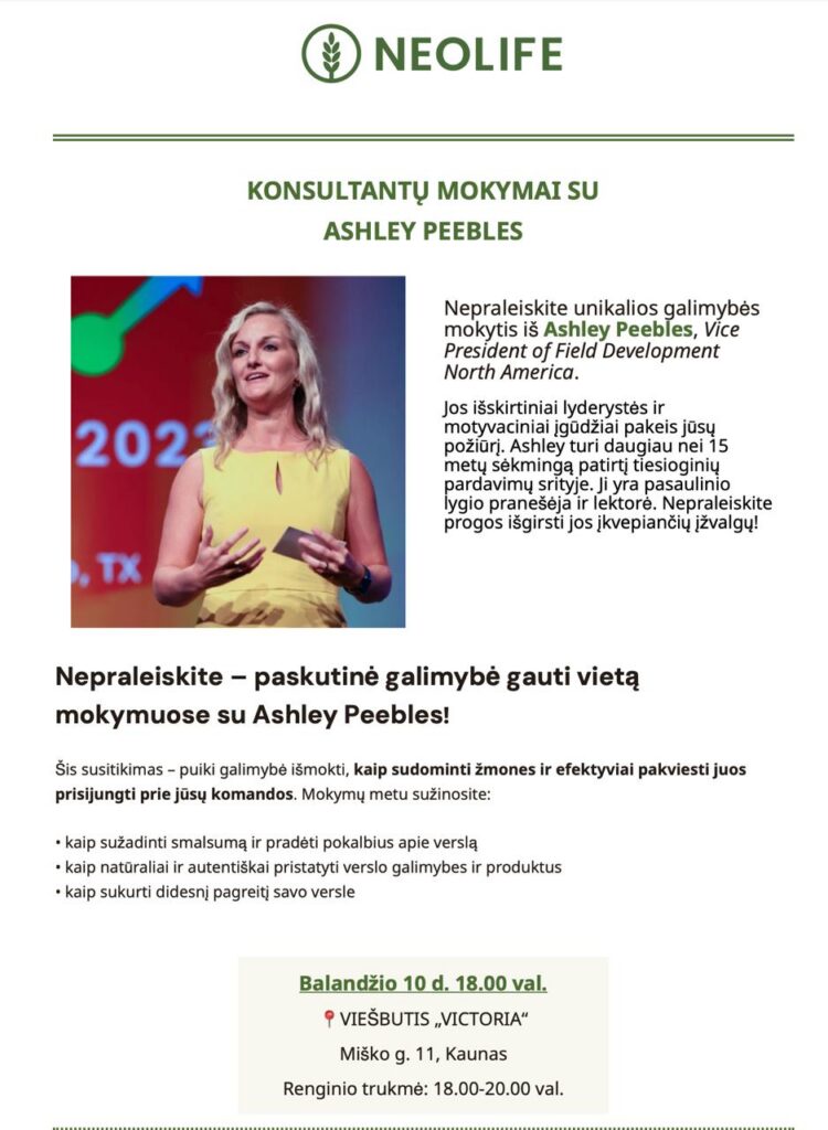 APRIL 2026: ASHLEY PEEBLES, Vice President of Sales for NeoLife North America, returns to Europe with a fantastic lineup of events: innovative and exciting business schools dedicated to all members, offering new insights, discussions, and, above all, targeted training to help you focus on growth. With over fifteen years of experience in the world of direct sales, Ashley is both an experienced and dynamic leader. We will be delighted to meet her and embrace her vision for growth.