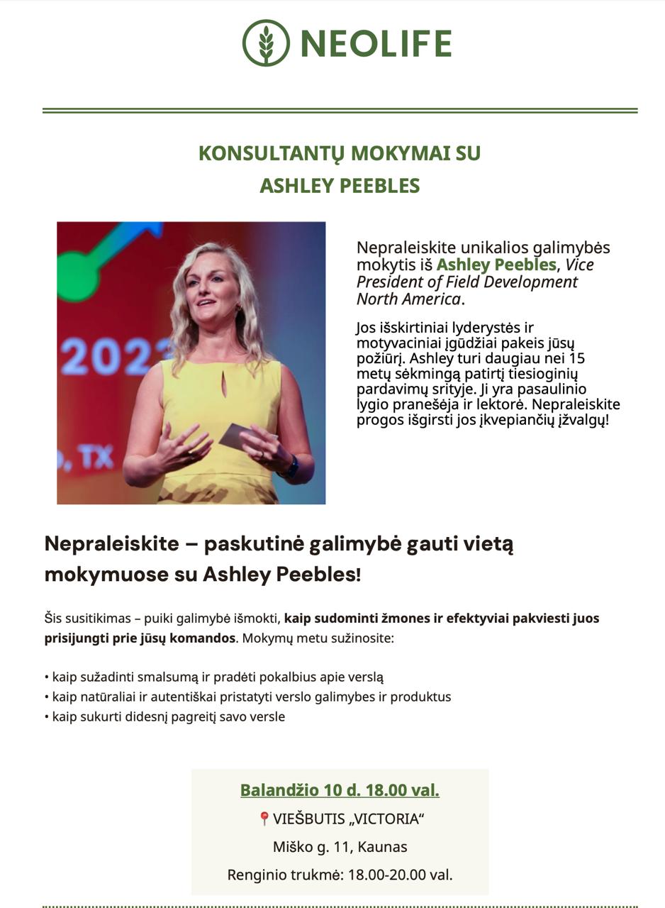 APRIL 2026: ASHLEY PEEBLES, Vice President of Sales for NeoLife North America, returns to Europe with a fantastic lineup of events: innovative and exciting business schools dedicated to all members, offering new insights, discussions, and, above all, targeted training to help you focus on growth. With over fifteen years of experience in the world of […]